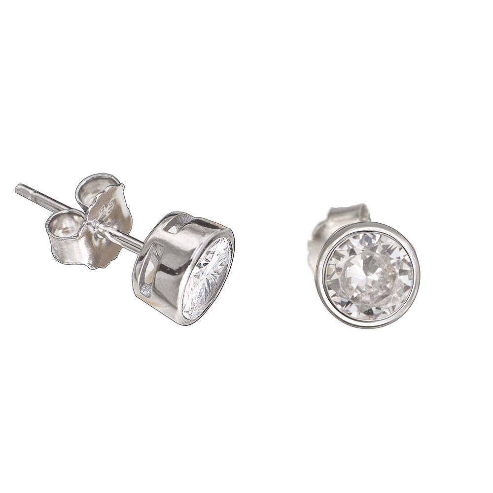 925-ös finomságú ezüst fülbevaló fehér cirkónia kővel, button foglalatban, ródiumozott