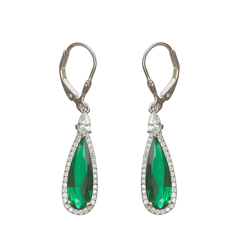 925-ös finomságú ezüst fülbevaló fehér és zöld cirkónia kövekkel, ródiumozott, patentzáras, hosszúság  3.8 cm, 4,3 gramm. Díszdobozban szállítjuk.