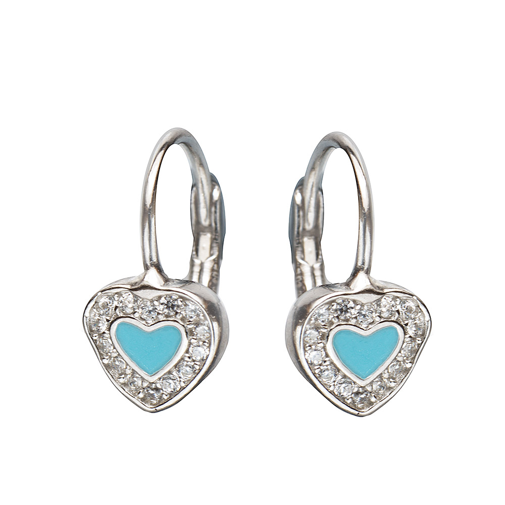 925-ös finomságú ezüst világoskék szív fülbevaló tűzzománcos és cirkonia köves betéttel, ródiumozott, patentzáras, hosszúság 14.0 mm, 1.4 gramm