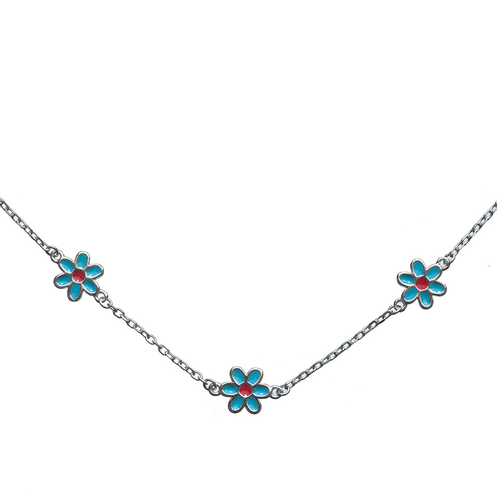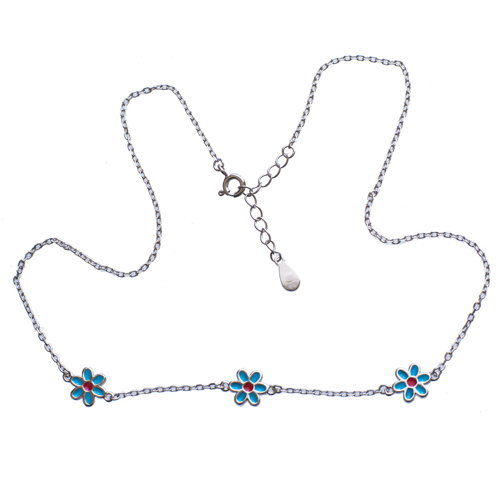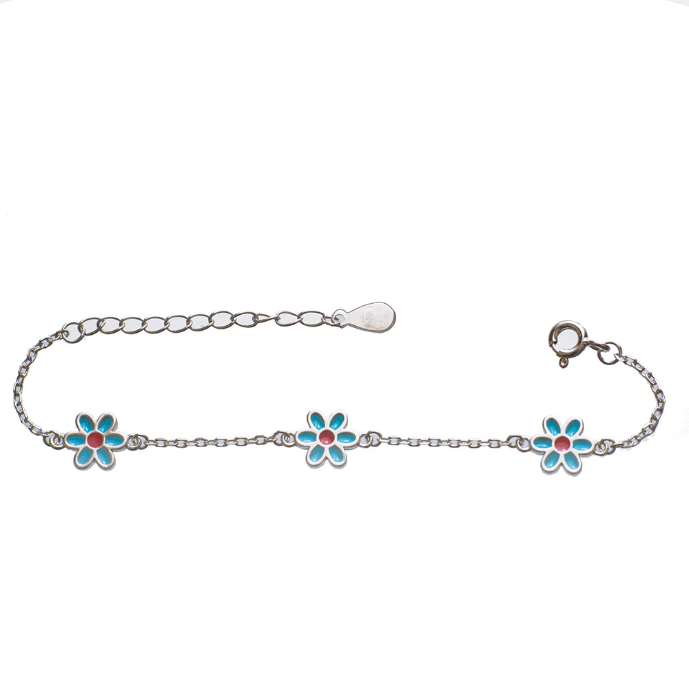 925-ös finomságú, ródiumozott ezüst gyerek karkötő kék virág betétekkel, állítható hosszúság: 11.5-14.5 cm, 2.0 gramm (a nyakláncával együtt szettben is megvásárolható)