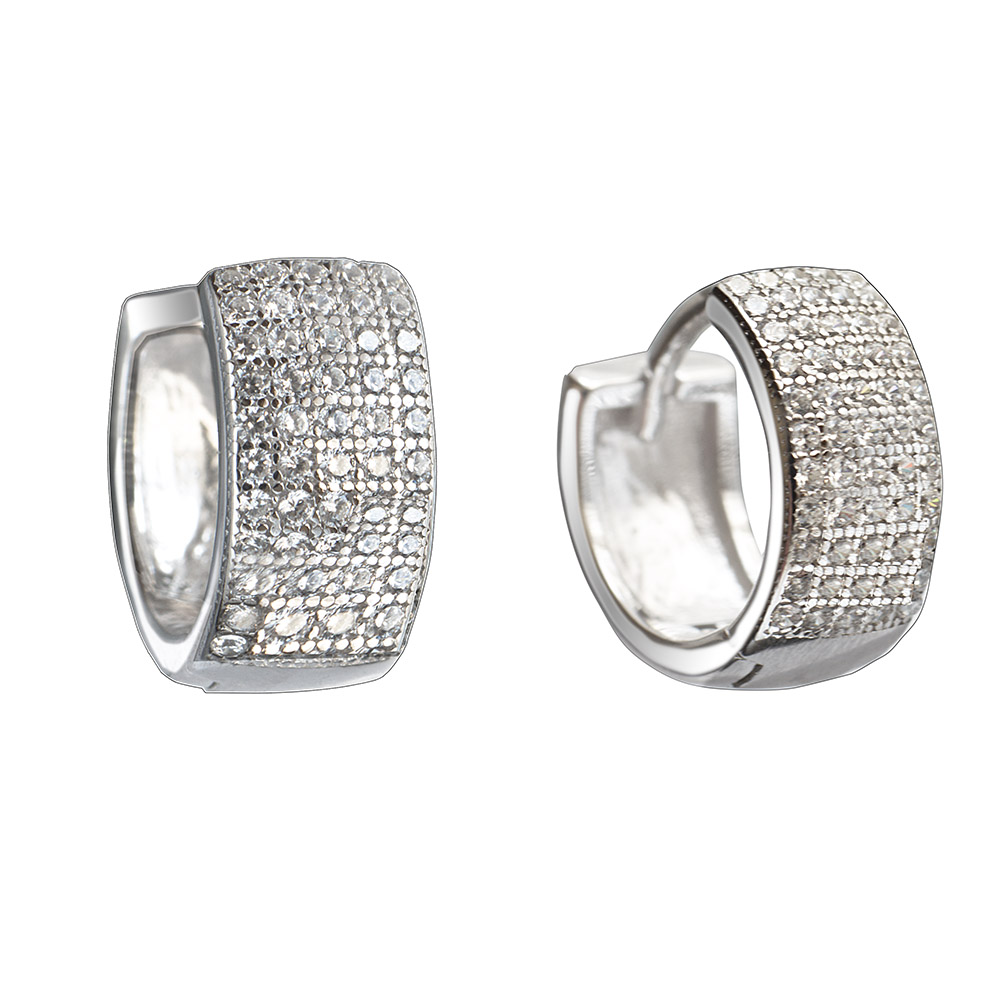 925-ös finomságú, ezüst karika fülbevaló fehér cirkónia kövekkel, ródiumozott, bepattintós zárral, átmérő: 13.0 mm, szélesség: 5,8 mm 3.4 gramm