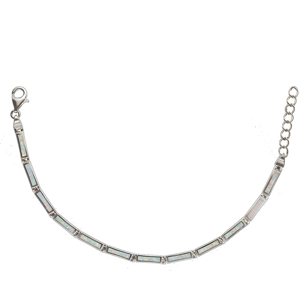 925-ös finomságú ezüst karkötő fehér opál kövekkel, ródiumozott, szélessége a köveknek 3.0 mm, hosszúság: állítható 18.0 – 19.5 cm között, 6.6 gramm Díszdobozban szállítjuk.