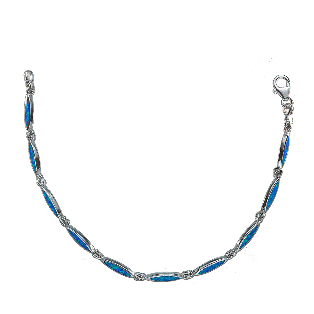 925-ös finomságú ezüst karkötő kék opál kövekkel, ródiumozott, szélessége a köveknek 3.5 mm, hosszúság: 19.5 cm között, 7.8 gramm Díszdobozban szállítjuk.