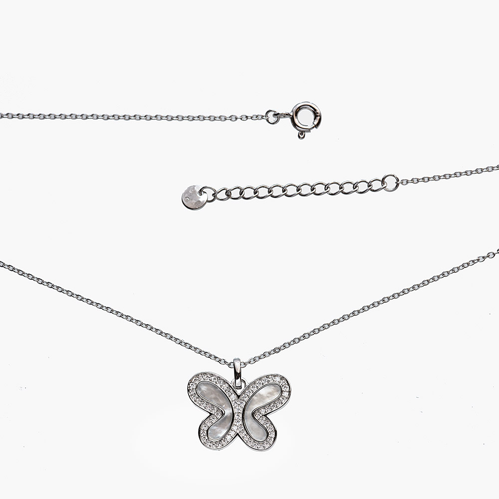925-ös finomságú ezüst női nyaklánc, fehér cirkónia kövekkel, pillangó medállal, ródiumozott, állítható hosszúság: .0-45 cm, szélesség .0 mm, gramm.