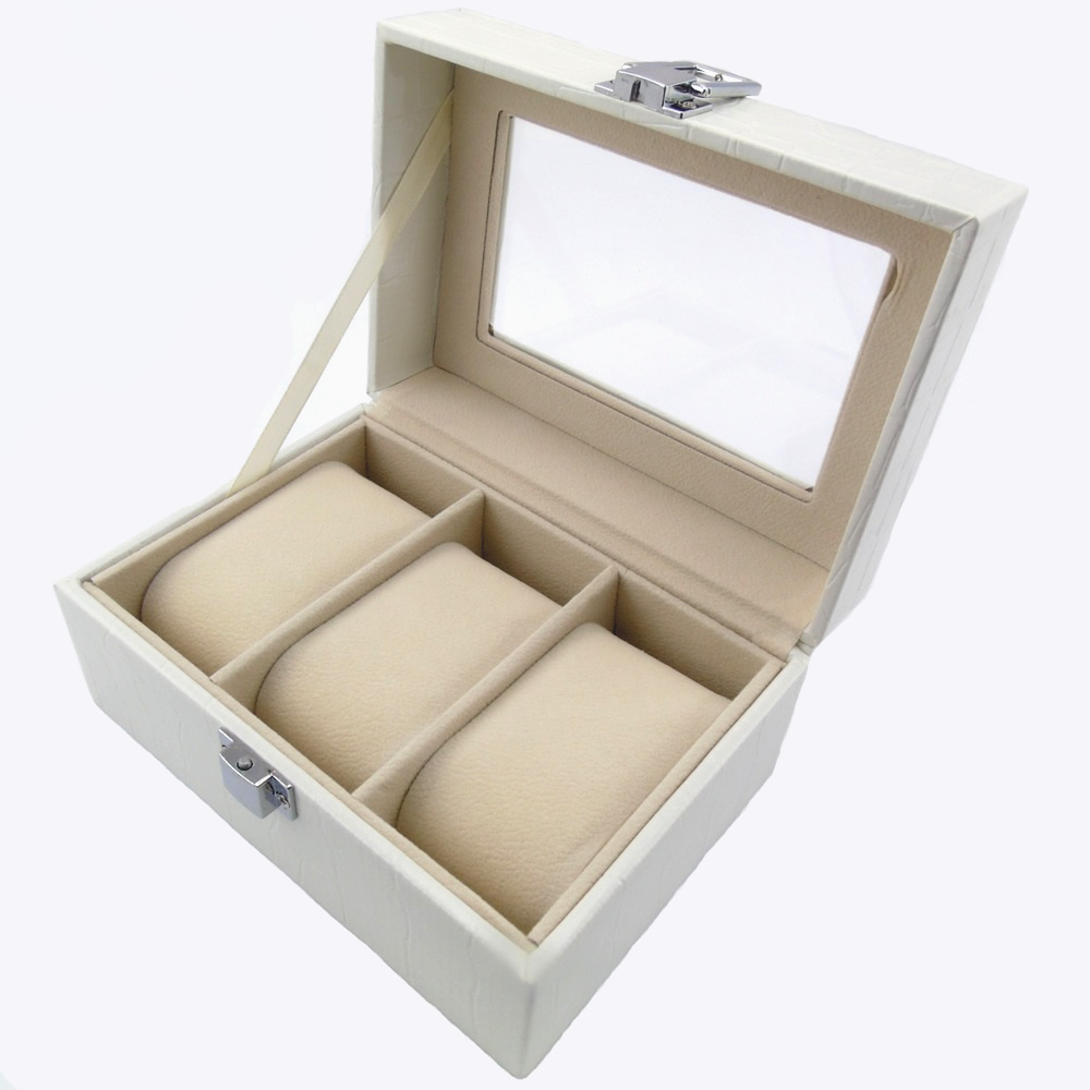 Fehér varrott, műbőr borítású óratartó doboz vajszínű filc betéttel 3 db órához. Külső méretei: szélesség: 16 cm, mélység: 11 cm, magasság: 8 cm