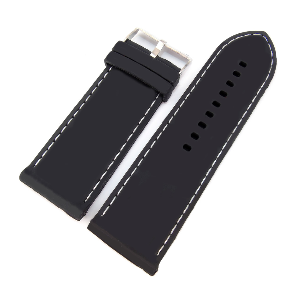 Fekete szilikon óraszíj, fehér varrással. Szélesség 26 és 30 mm, a hosszúság állítható (a rendeléskor a megjegyzés rovatban kérjük megadni a választott méretet).