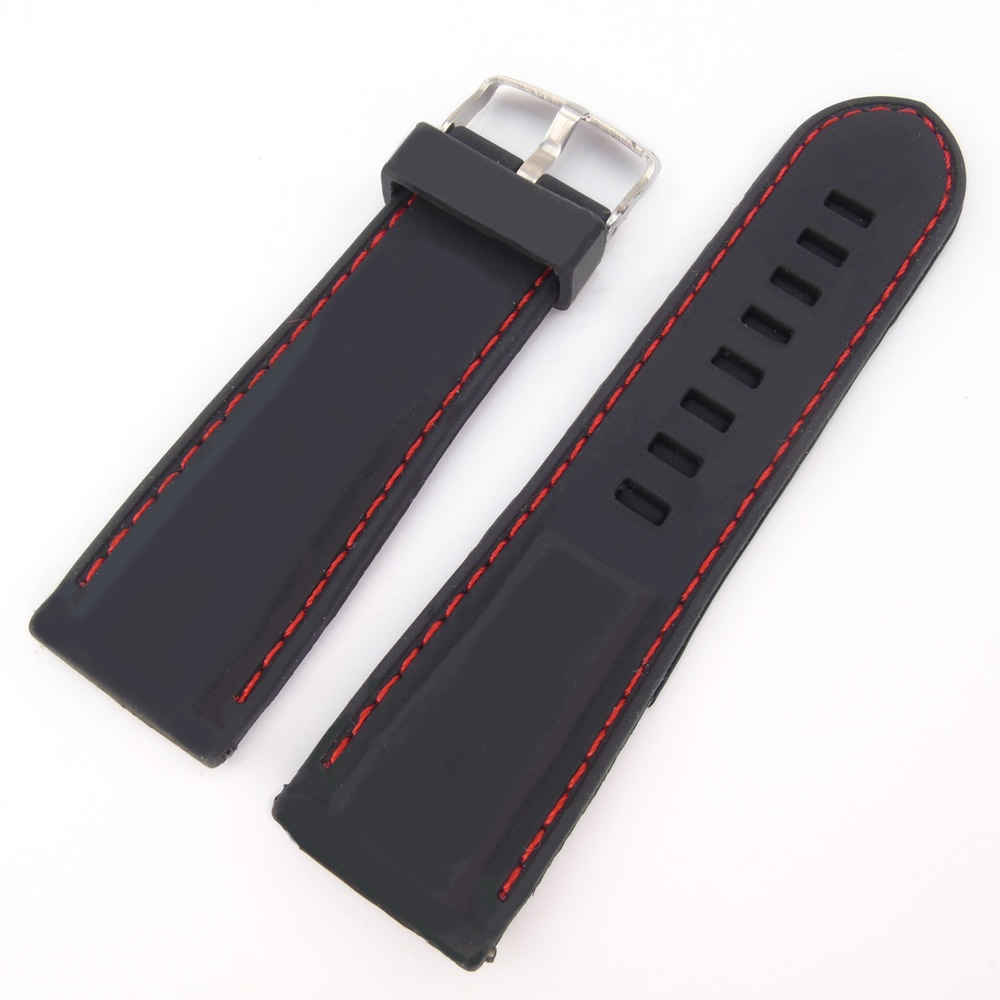 Fekete szilikon óraszíj, piros varrással. Szélesség 26 mm, a hosszúság állítható.